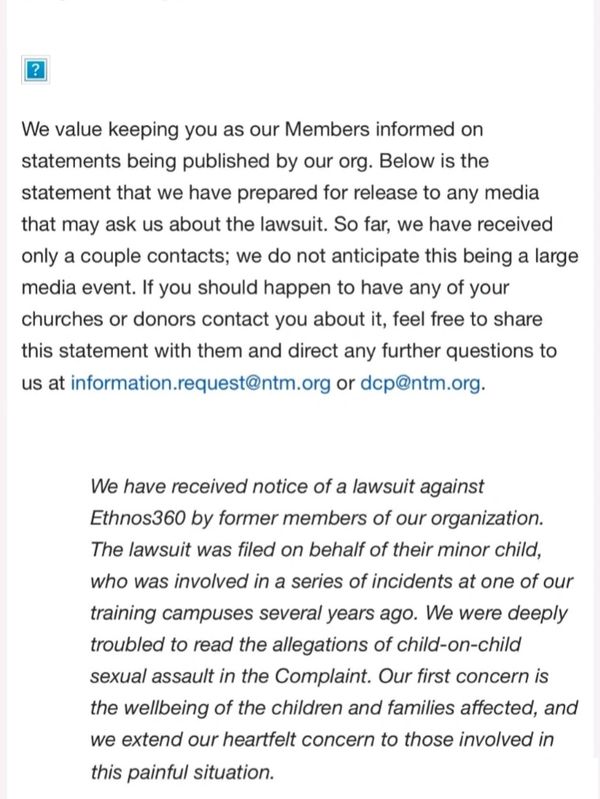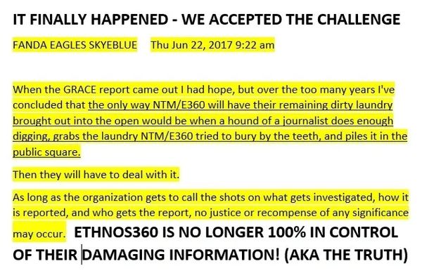 This is only one of many brave New Tribes Mission* Child Abuse Survivors who have been trying to sound the alarm to Ethnos Members that the top Leadership of Ethnos360 is engaging in a massive series of Abuse Cover-ups.
