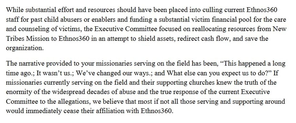 In our opinion, based upon the massive documented evidence we have seen, this is a problem within Ethnos Mission Leadership. The Ethnos360 Mission itself, like the rest of us, is a victim of what has been done in secret by a few men at Mission HQ.