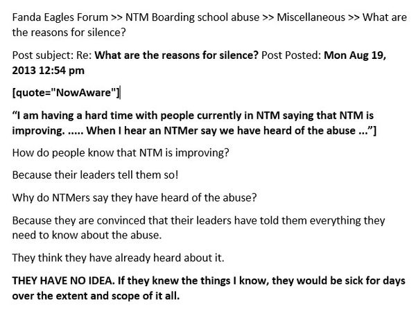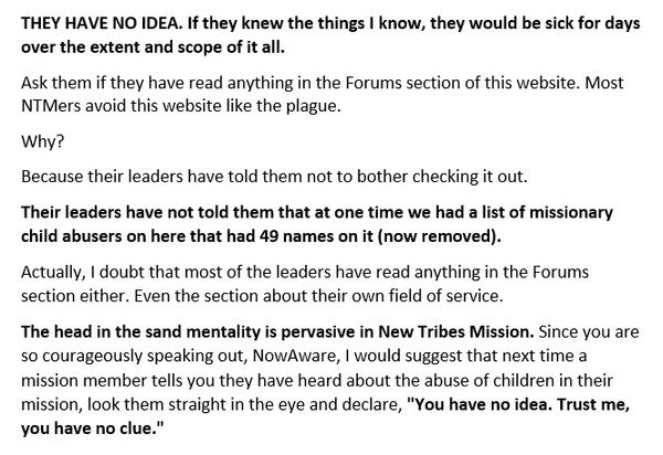 Keep in mind that 100's of NTM Mk's who were the victims of scores of Child Predators over the years have been desperately trying to get the attention of the Mission Membership at large for more than 13 years, with almost no success.