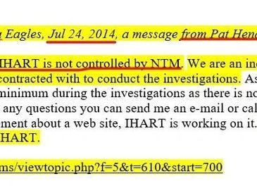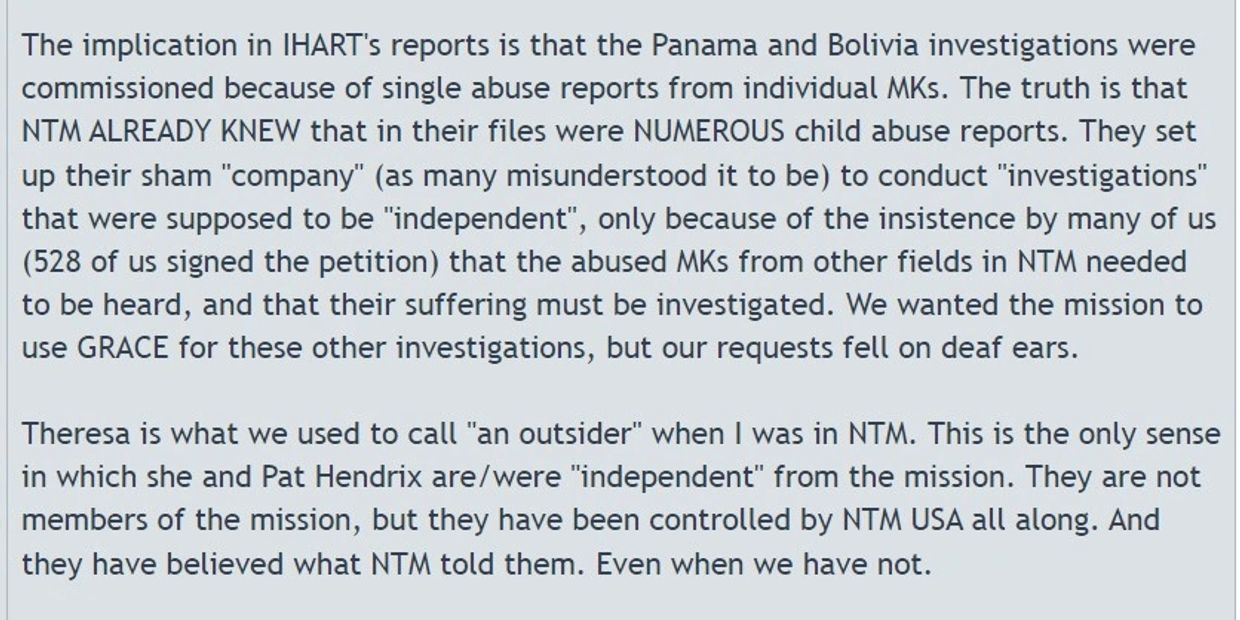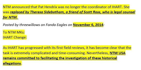 First NTM said IHART was independent and they had no control over the investigations. That falsehood was exposed in 2014 when NTM fired the 'independent' director! Then they brought in NTM's long time "fixer" Atty Theresa Sidebotham who announced that IHART was actually "a process"... 12 years from inception, Abuse Victims are still waiting for "reports".